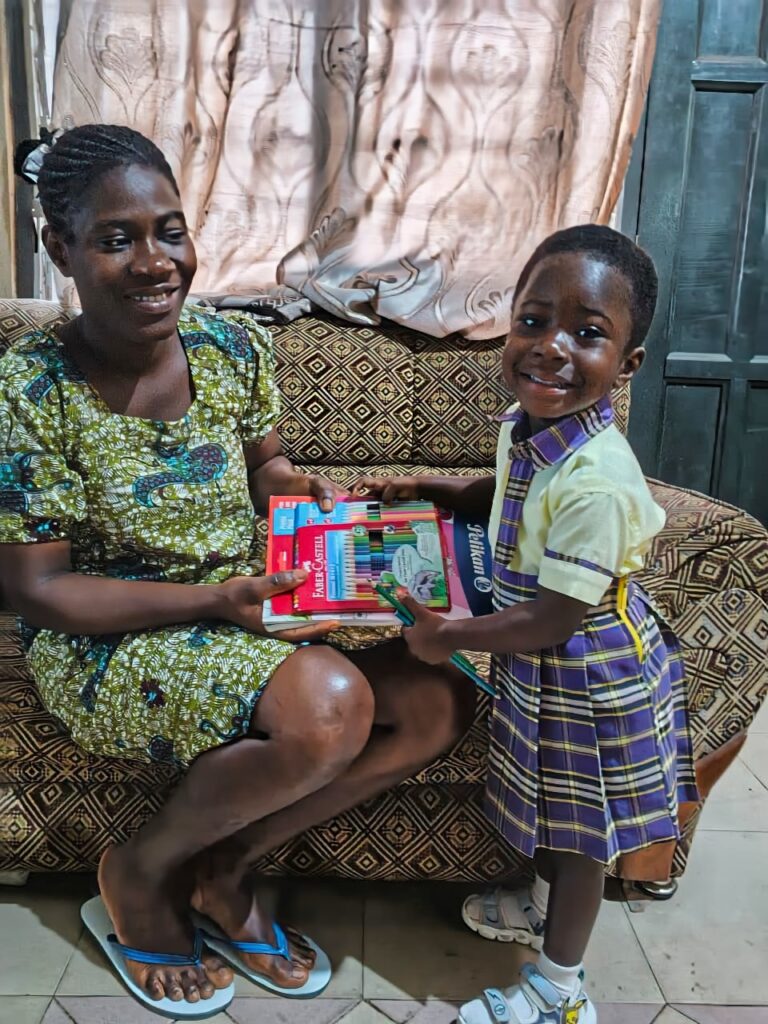 Das ist little Stefanie mit ihrer Mama. Kofi hat seine Tochter den Namen Stefanie gegeben, da Stefanie und Kofi sich vor sechs Jahren in Ghana angefreundet hatten. Nun haben wir ein Namens Patenkind. Wir haben ihr eine Kiste Lego mitgebracht. Kofi’s Frau wollte auch eine goldene Armbanduhr.