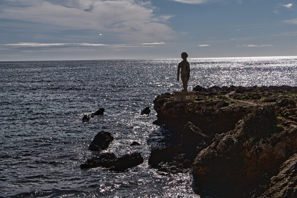 Wir fahren beschwingt zum Kap San Vito und freuen uns, dass heute ein Wochentag ist und die Bevölkerung arbeitet und wir die Leere genießen können. Von Marsala ist das Kap 65 Km entfernt und wir sehen uns auf der Fahrt dort hin die Schönheiten der Insel an.Ankunft in San Vito Lo Capo. Wir parken an der heiligen Statue und fühlen, dass der Mönch uns etwas mitteilen möchte.Unser Blick geht in Richtung Strand und Fußgängerzone und wir sehen hunderte von Menschen in den verschiedensten Aktionen, Techno Tanz, Essen oder Lustwandeln in der Einkaufsmeile. Der Mönch sieht uns an und „sagt“, Si, heute ist ein Nationalfeiertag, Festa della Repubblica Italia, Tag der Republik. Da gucken sich zwei Touristen entgeistert an.Aber wir nehmen es mit Humor.Die Techno Freaks am Strand.Die Fußgängerzone, umsäumt von Souvenirgeschäften, Restaurants und Bars. Man sagte uns, dass viele aus Palermo angereist sind. Eigentlich hat der Ort 4700 Einwohner, aber heute?Kein Wunder, dass die Besucher hier so zahlreich sind. Der Strand ist toll, breit und lang.An Hotels und Restaurants herrscht kein Mangel. Wir müssen uns etwas von den Lärm erholen und besuchen die Kirche im Ort. Kühl und ruhig.Nach einer seelischen Einkehr geht es wieder durch die herrliche Landschaft nach Hause.Es wird Abend und der Strand von Golfo del Cofano leert sich langsam.