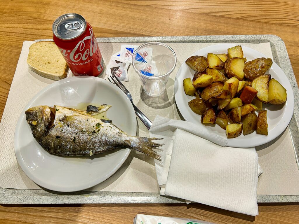 Pause in einer großen Raststätte. Ich bestelle immer Huhn mit Reis. Da kann ich nichts falsch machen.